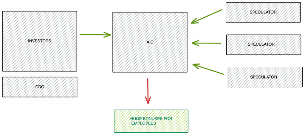 And again because of poor regulations, AIG did not have to put money aside to pay these buyers of CDS in case the CDOs they have insured went bad. AIG instead gave its employees huge bonuses as they sold more CDS.